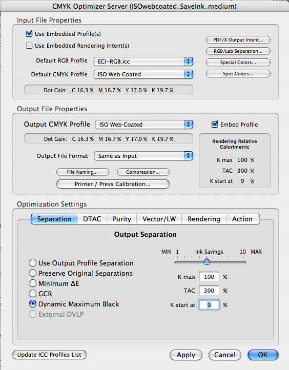 Einer der größten Vorteile von CMYK Optimizer besteht darin, dass die für die Umrechnung benötigten DeviceLink-Profile automatisch und basierend auf der zuvor erfolgten Datenanalyse jeweils dynamisch berechnet werden. Diese müssen also nicht - wie bei anderen Lösungen - zuerst statisch vorberechnet werden. Dies garantiert stets eine optimale Farbtransformation zwischen den Eingabedaten und dem gewünschten Zielfarbraum gemäß den geforderten Einstellungen und Rahmenbedingungen.